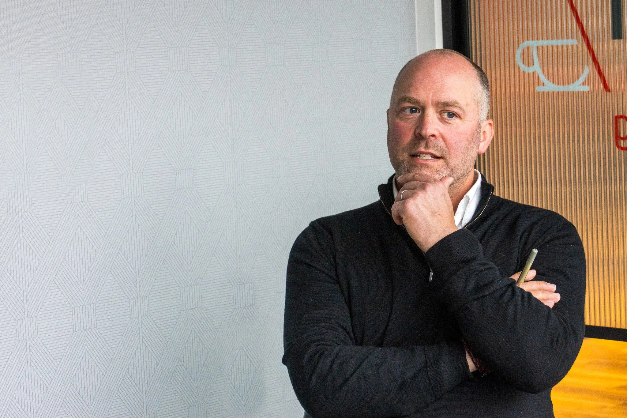 A smiling man in a white shirt sitting at a desk with a phone and a laptop in an office setting.
